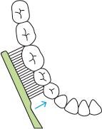 境目に対して斜めに歯ブラシの毛先をあてて、歯周ポケットに差し込むように動かす。