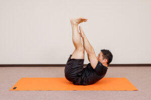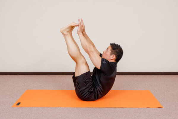 スクワットのしゃがんだ姿勢から斜め前方に足首、膝、股関節を伸ばしていきます。